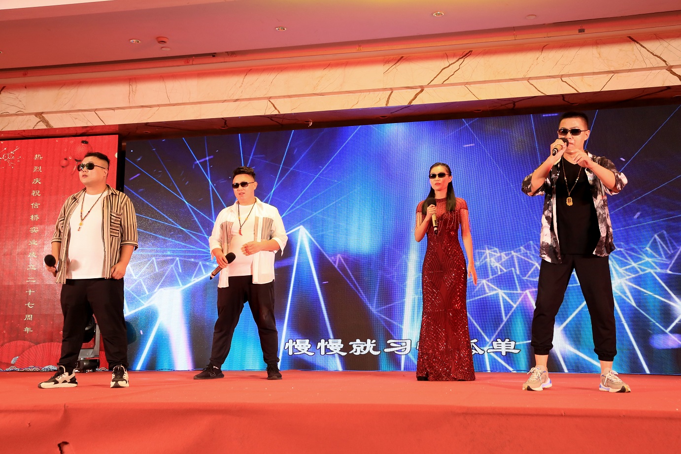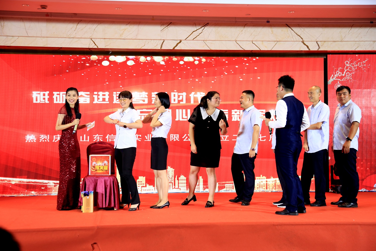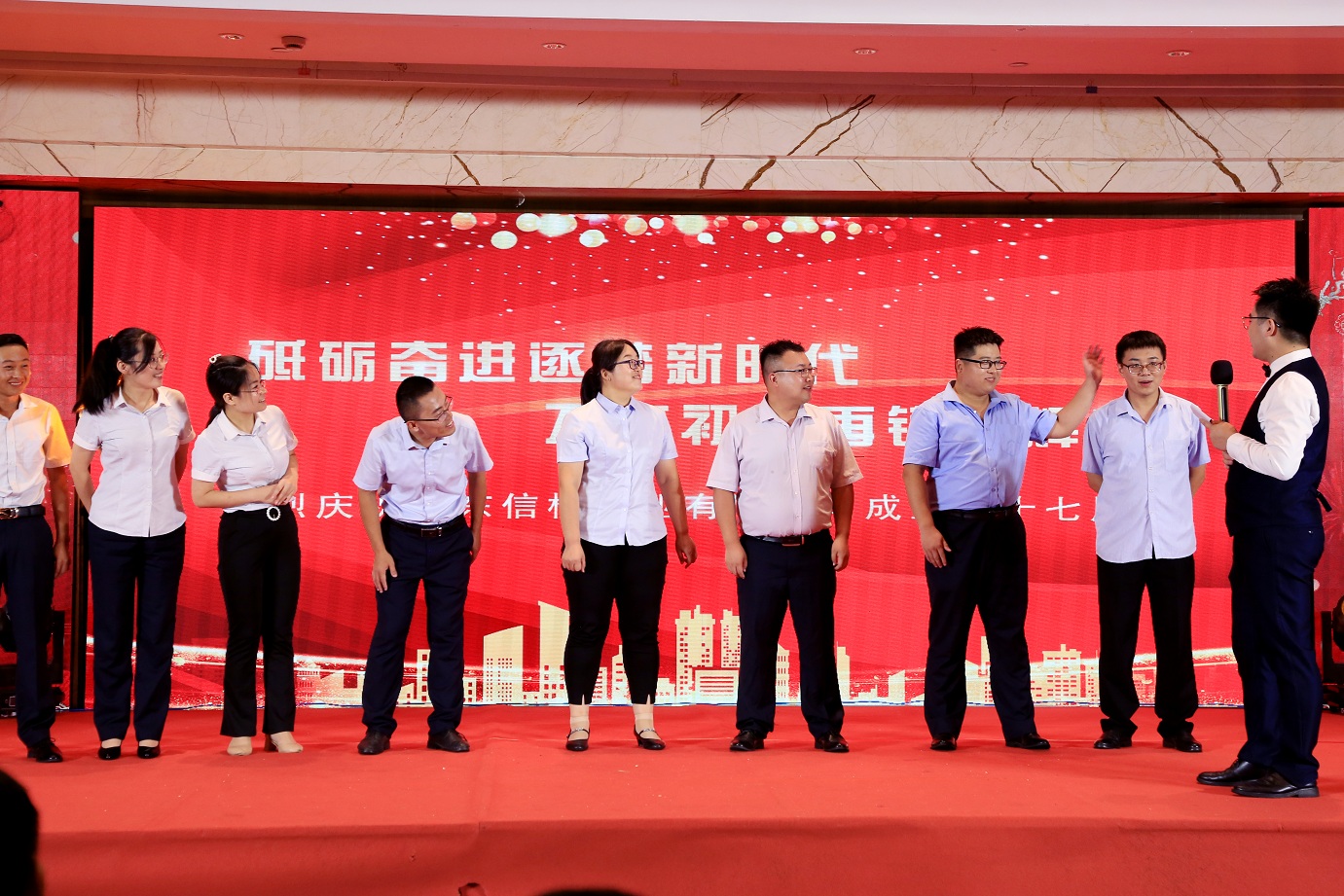 此次慶典晚宴參加人員除了信橋全體員工之外,還有部分老領(lǐng)導(dǎo)和老朋友,大家共同分享了信橋二十七周年的喜悅與精彩。八號上午,慶典開始之前,演員們辛勤排練,燈光師、音響師共同配合,所有人為了晚會都在努力。下午4點58分,晚會正式開始,全體員工與領(lǐng)導(dǎo)集體合影,信橋隊伍不斷在擴大。今年的晚會添加新的互動方式,采用了直播和紅包雨的新形式,是信橋周年慶典的一次新的嘗試。
